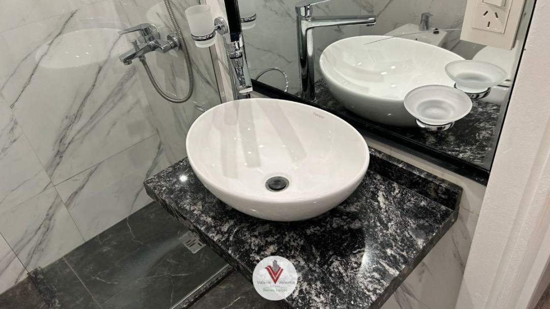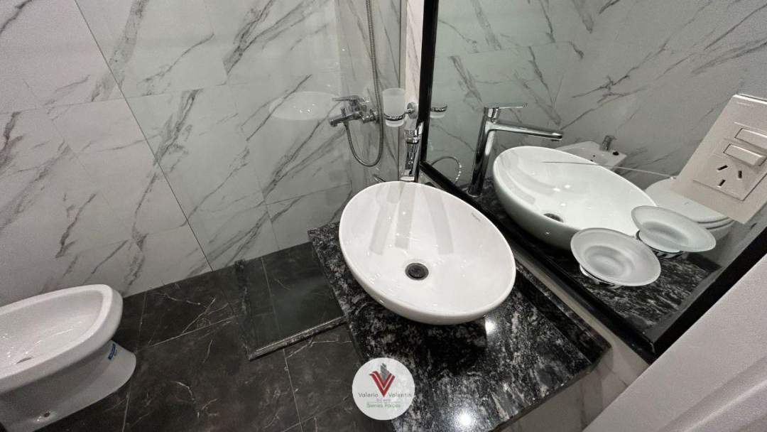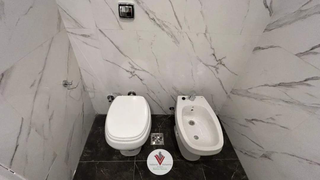 Baño de Categoría: Revestimientos en mármol de Carrara y detalles en negro, con bacha de apoyo y grifería de última generación.